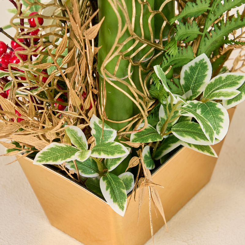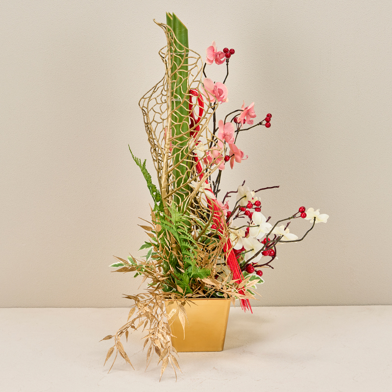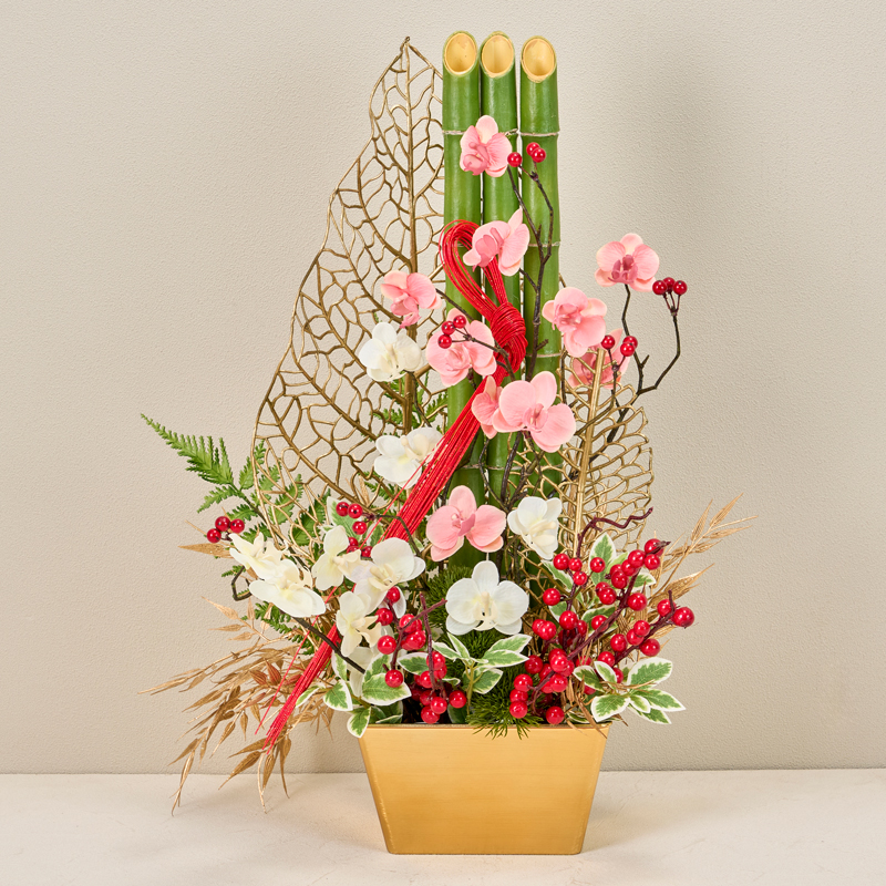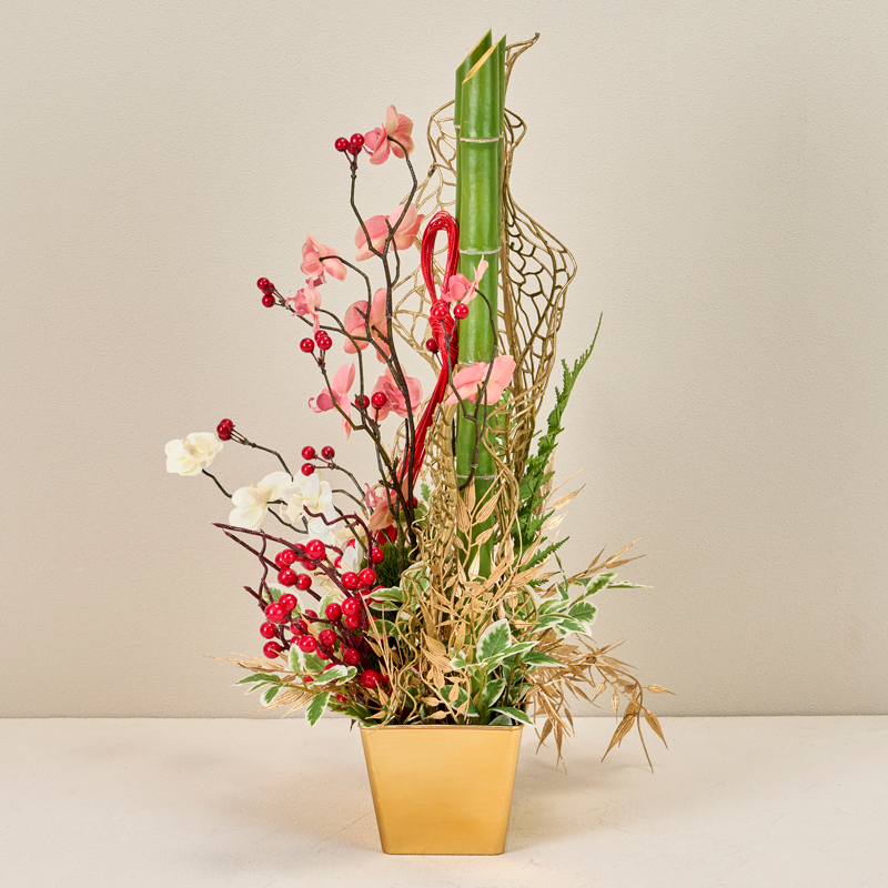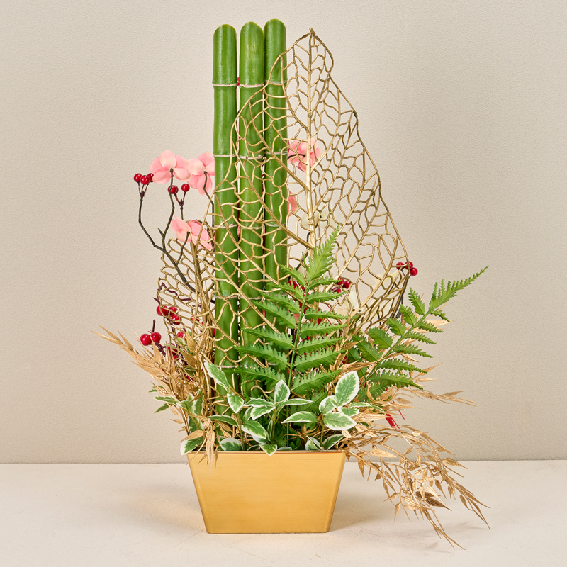 コメント | プラべにフォームをセットし竹を真っすぐ並べて挿します。前後にメッシュリーフを挿し、花材はリーフのメッシュを隠さないように挿していきます。 |