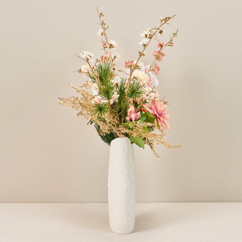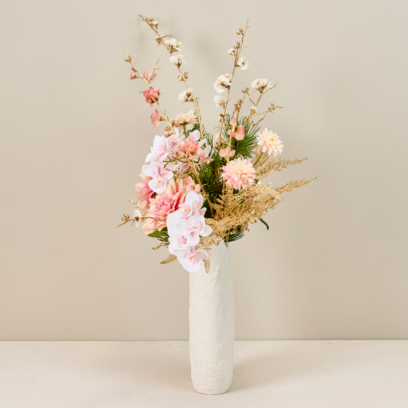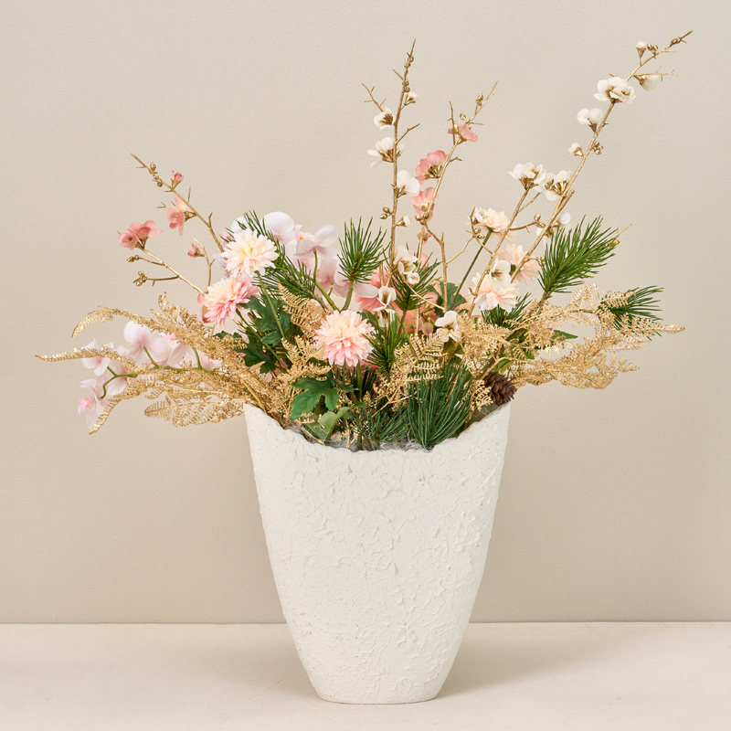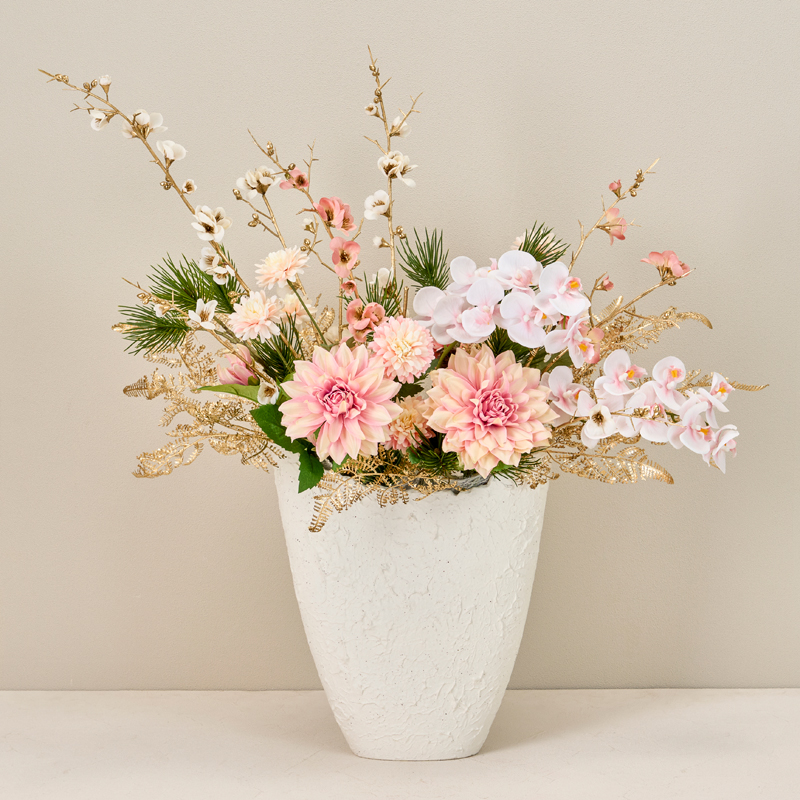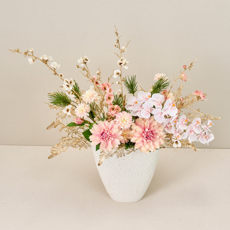 コメント | 煌びやかな梅にダリアやファレノを合わせた豪華なアレンジメントです。底に油粘土を入れて隙間に新聞紙などの紙を詰めてからフォームセットすることでベースを安定させています。 |