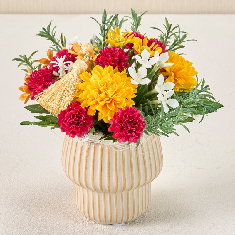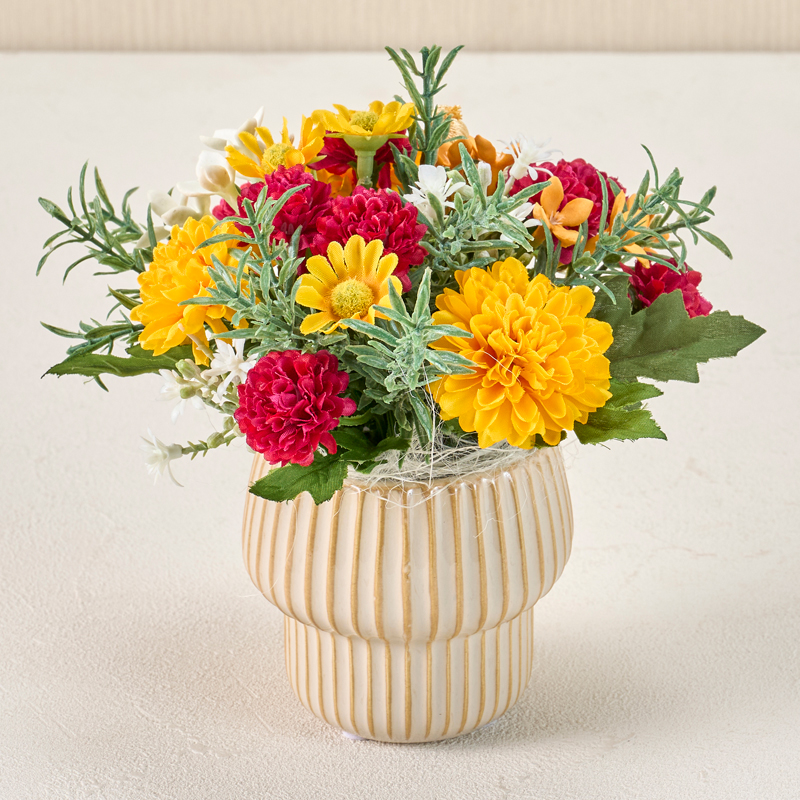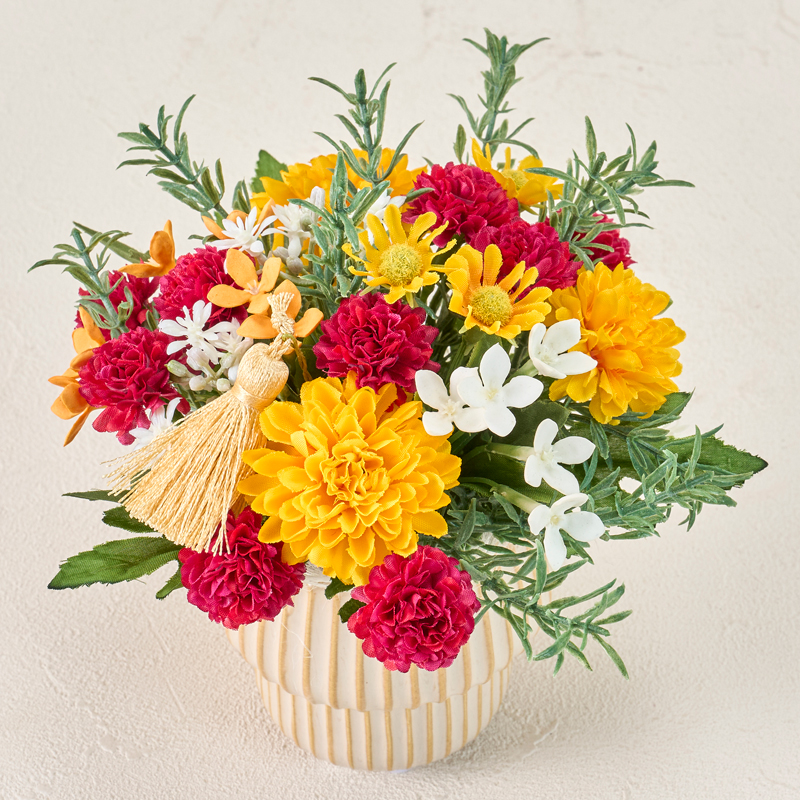 コメント | ベースにフォームをセットして花材を挿しています。丸い花と花芯が見える花が一本のステムについているマムの特徴を生かし、和になりすぎないミニアレンジに仕上げています。色バリエーションを楽しみましょう。 |