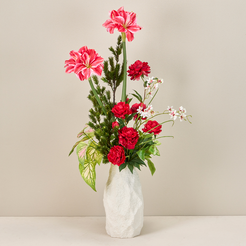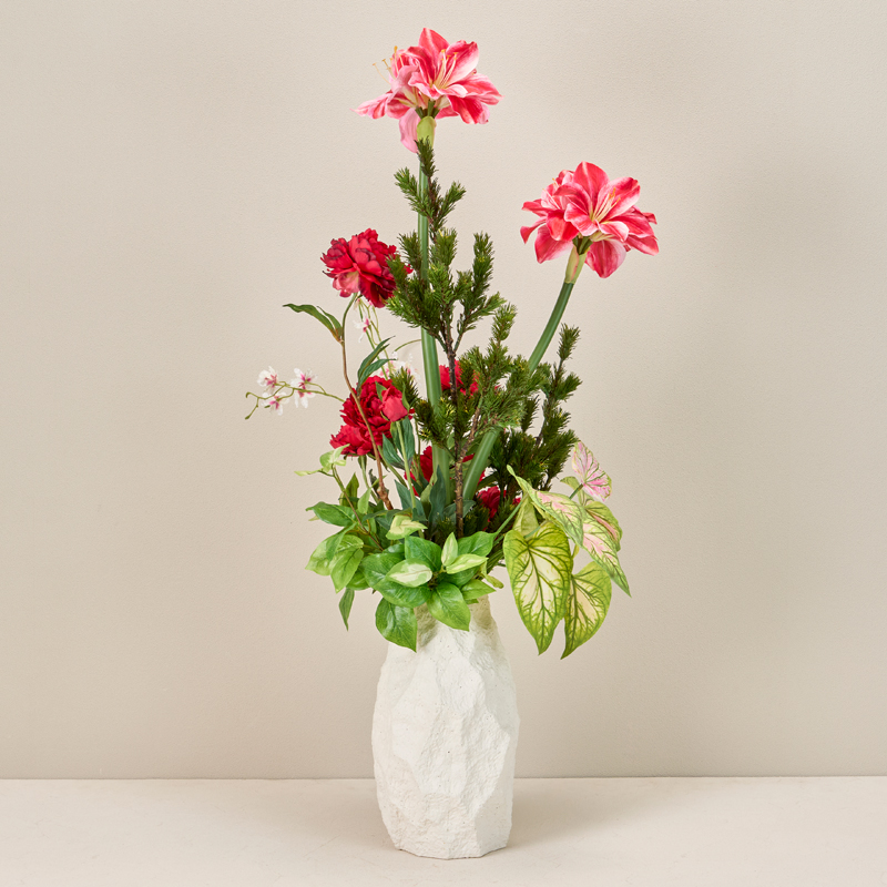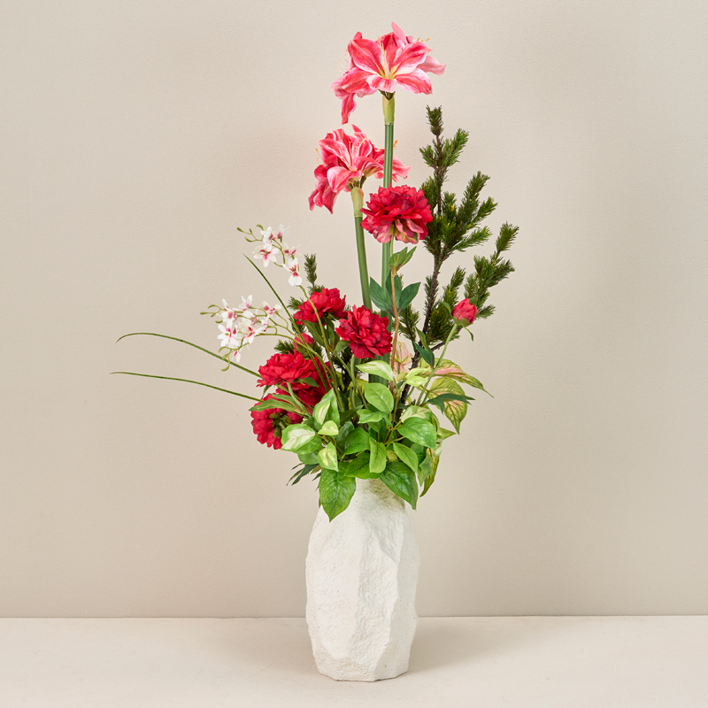 コメント | 下葉に明るめのグリーンを合わせ、生花のような色彩にまとめました。アマリリスを高めに生け太い茎のラインを生かし、高低差をつけながら初春らしいスッキリとしたデザインにしています。 |