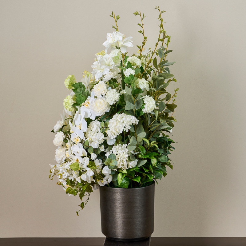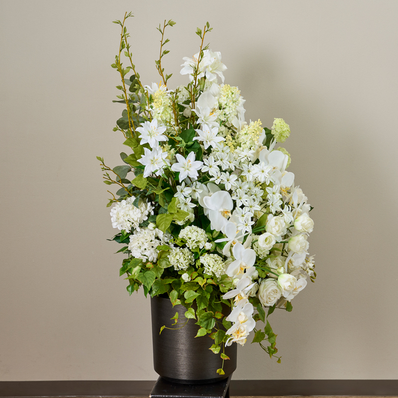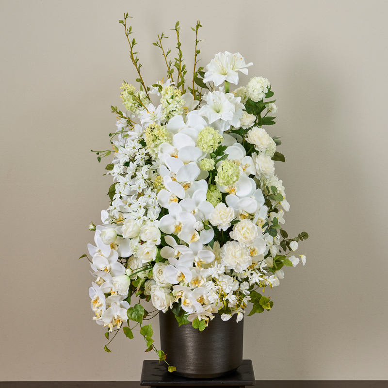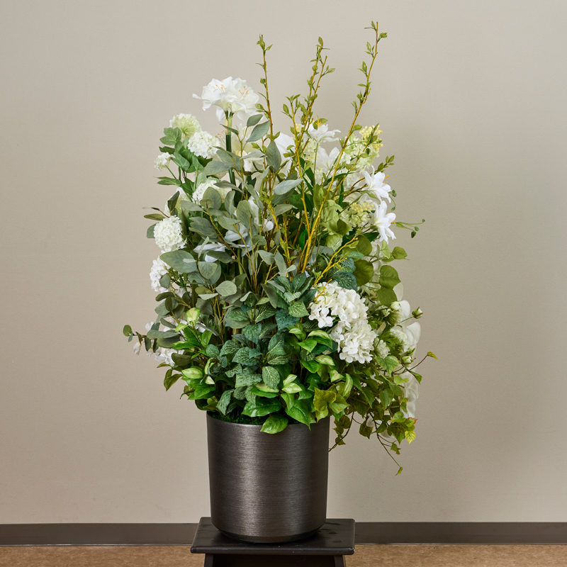 コメント | ベースにフォームをセットして花材を挿しています。白や淡いグリーンの濃淡を合わせることで上品な華やかさを演出しています。 |