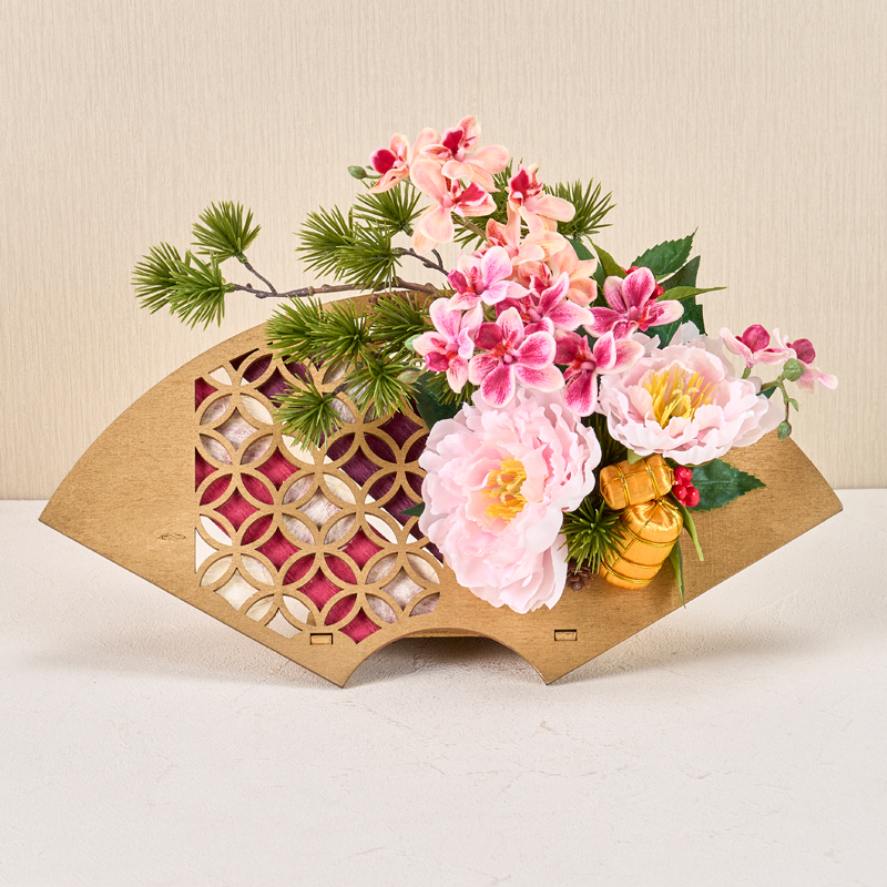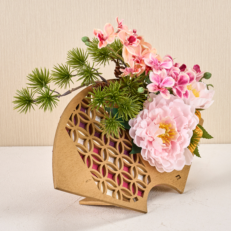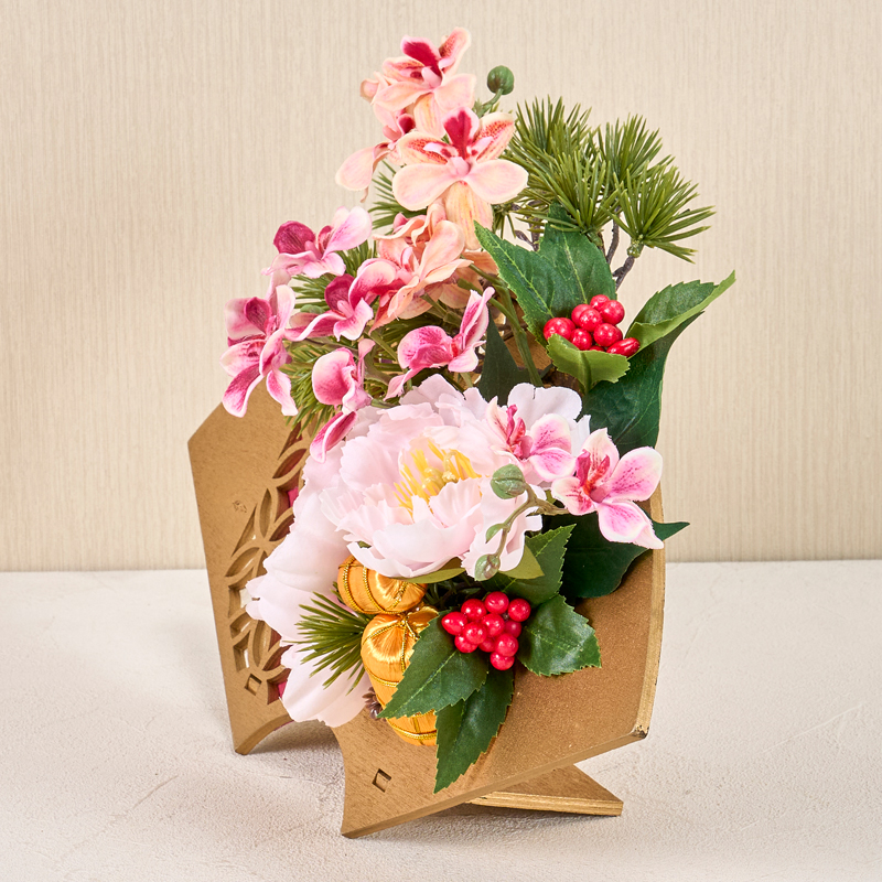 コメント | ベースの透けのある所に後ろからペーパーを貼ってます。花材は直接グルーで接着しています。ピンク系でまとめ、優しい印象に仕上げました。 |