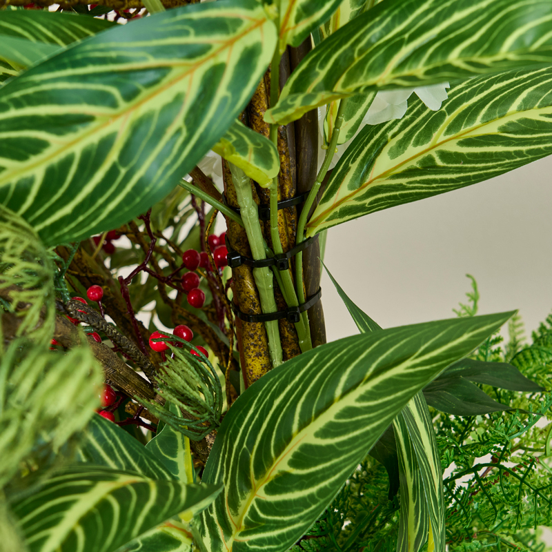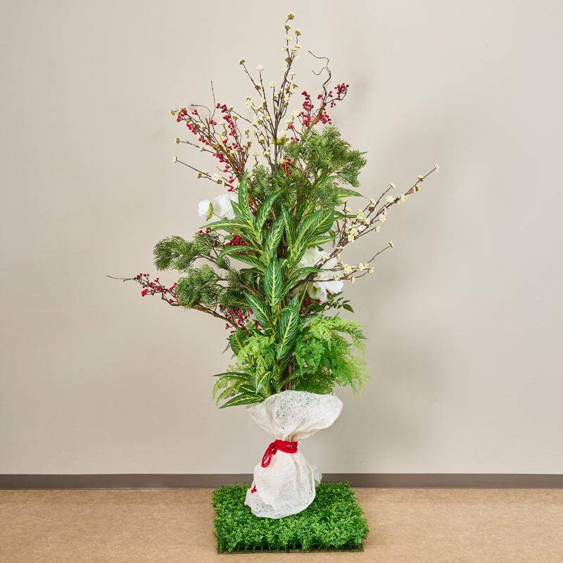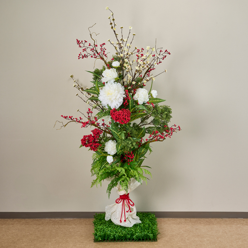 コメント | ブラックスタンドの中心軸にマットを挿しこみ下の台をカバーします。上から360度花材が見えるように軸にケーブルタイで留めていき、下までいったら長いステムはカットして紙を巻いて紐で巻き留めます。 |