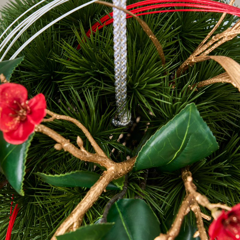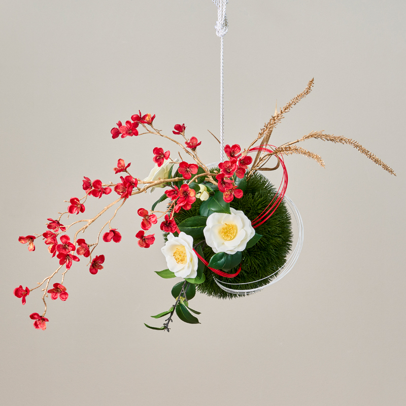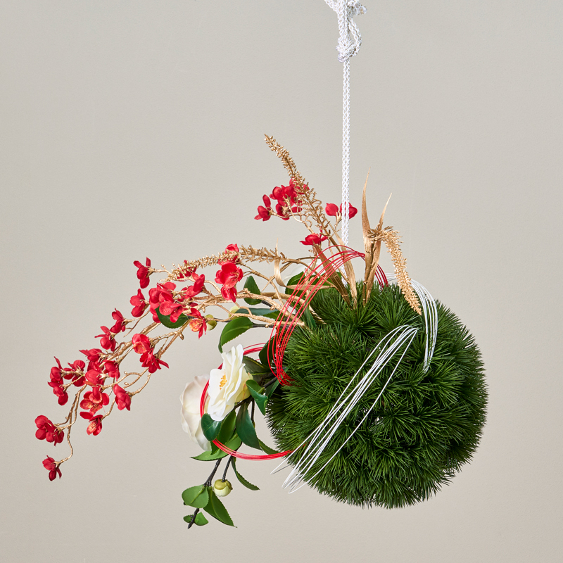 コメント | バランスを見ながら花材を配置し、茎をカットして松ボールの中の軸にケーブルタイで固定します。水引はカットして数本まとめ両サイドをワイヤーで留めつけ、茎と同じように松ボールの中にケーブルタイで固定します。 |
