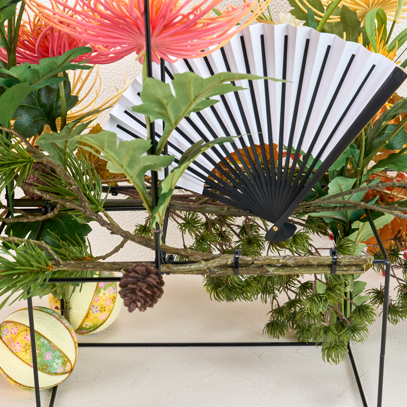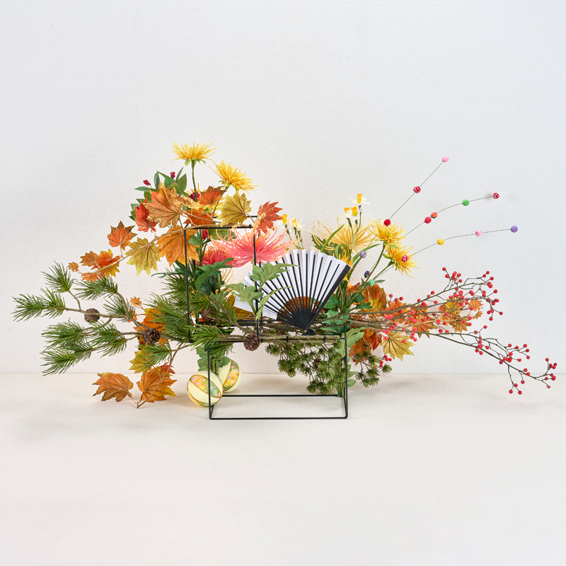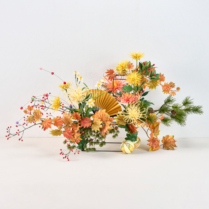 コメント | ワイヤーベースに花材をケーブルタイで留めながら伸びやかにアレンジしていきます。手毬はワイヤーが通るように目打ちで穴を開けベースに固定しています。 |