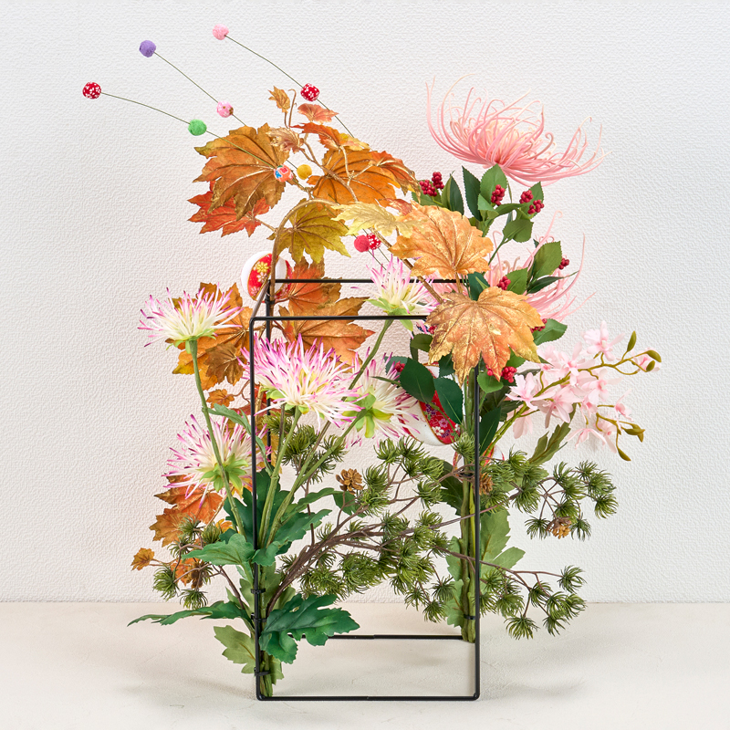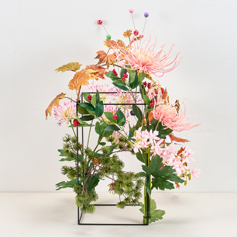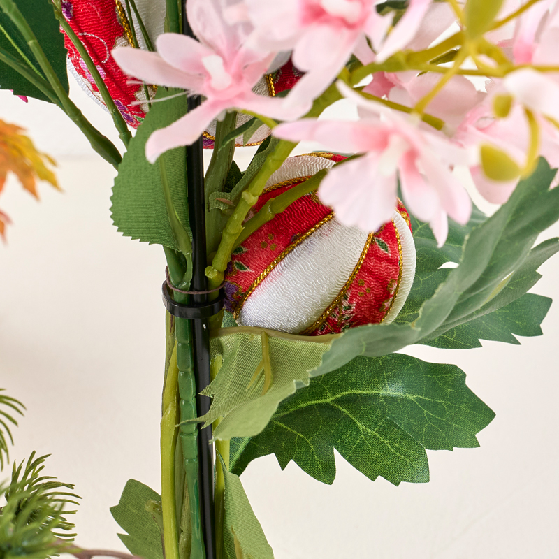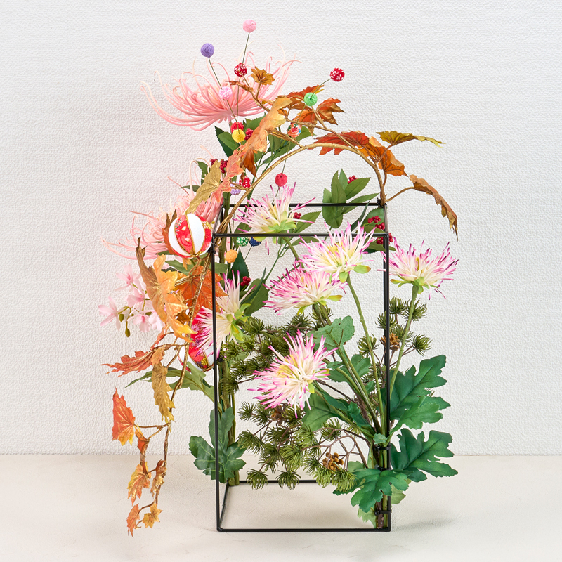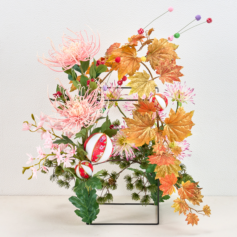 コメント | ワイヤーベースに花材をケーブルタイで留めながら伸びやかにアレンジしていきます。手毬はワイヤーが通るように目打ちで穴を開けベースに固定しています。 |