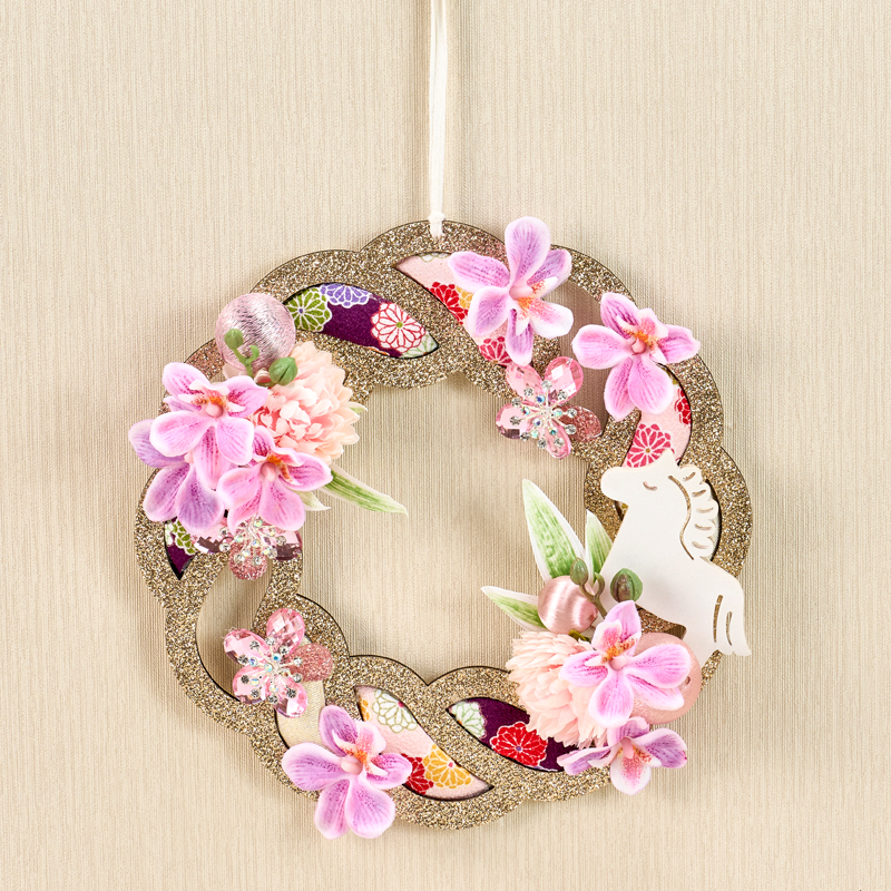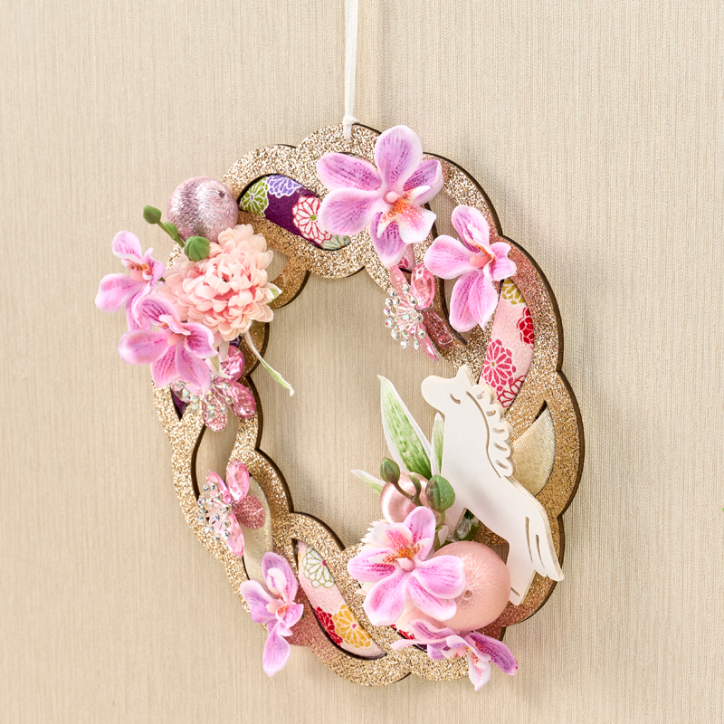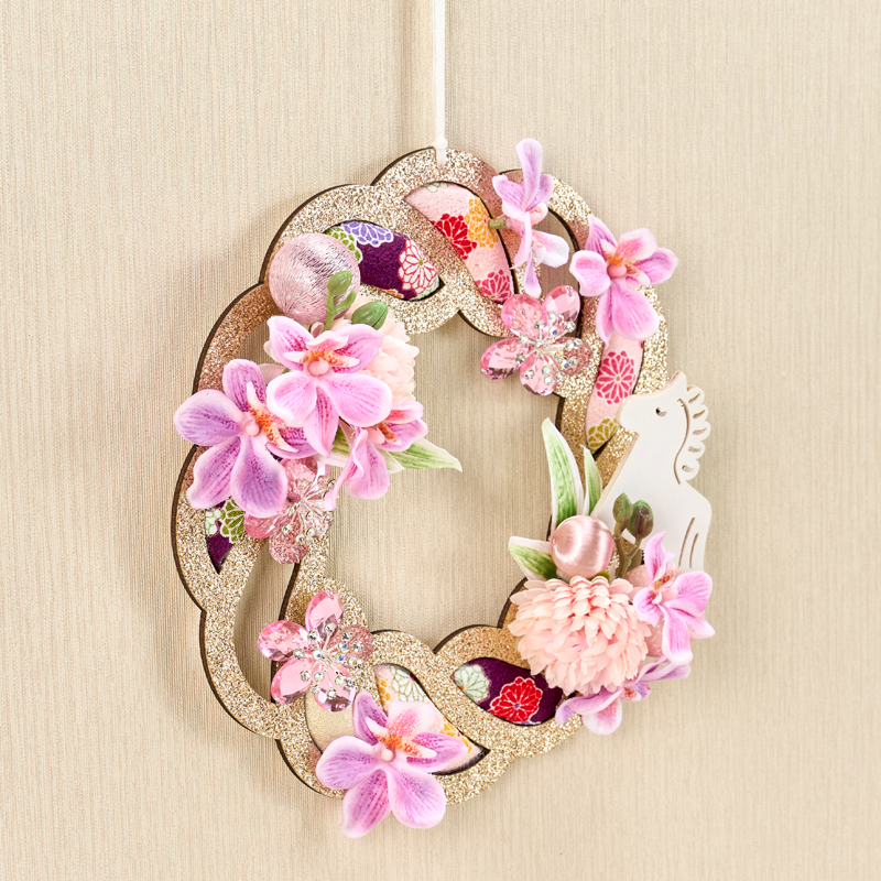 コメント | ベースの裏からちりめんリボンを貼り、綿を詰めて膨らませています。優しい色の花材でまとめました。 |