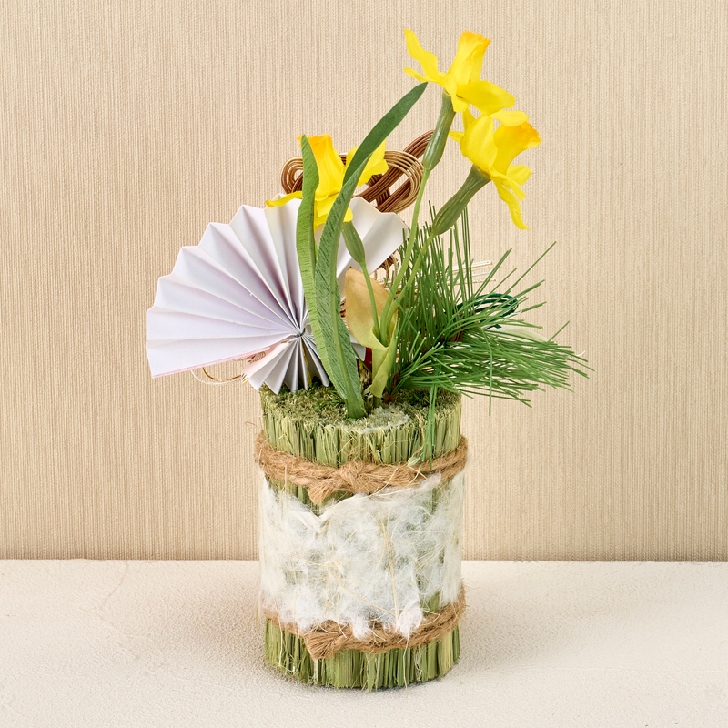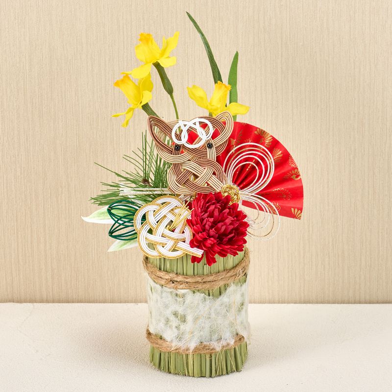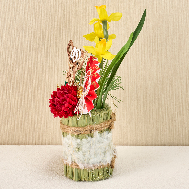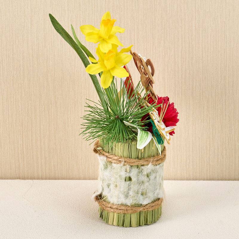 コメント | 麻入落水紙はサイドを手でちぎり、雰囲気を出しています。花材は少な目にして正月パーツをたくさん使いました。 |
