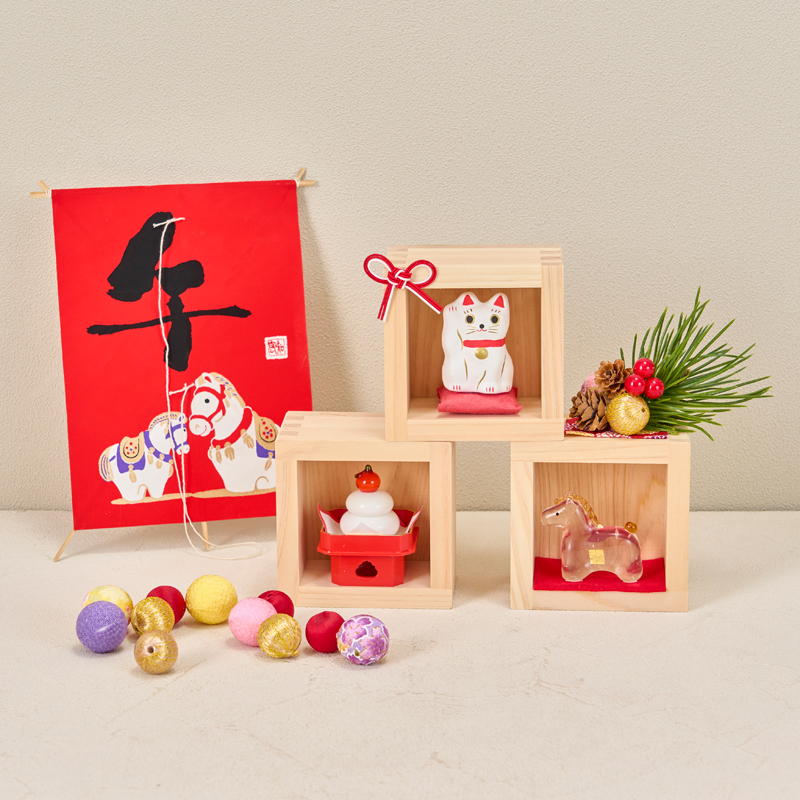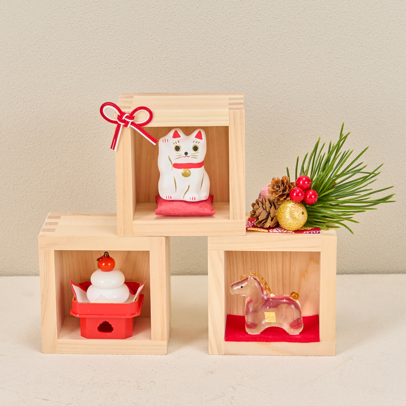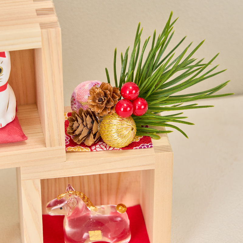 コメント | 升に入るサイズの置物を合わせ、両面テープで軽く固定しています。松や実物はリボンを台座にグルーガンで接着しています。 |