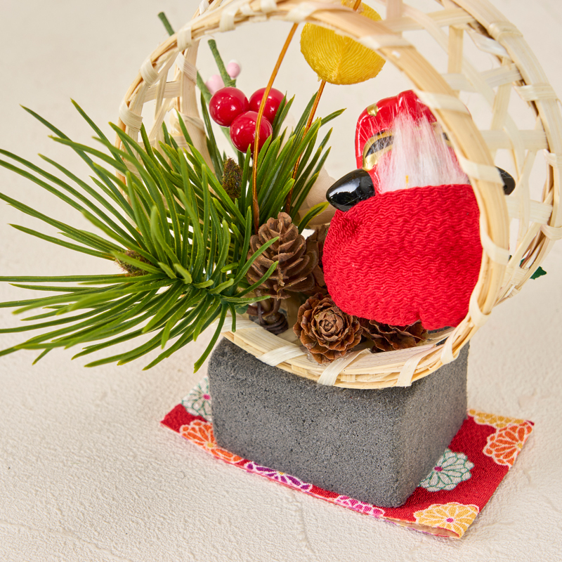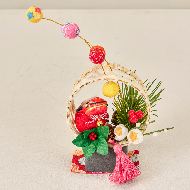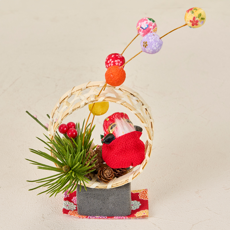 コメント | カットしたレインボーフォームに竹リングをUピンで留めて固定し、両面テープで貼り合わせた台座にグルーで接着して安定感を出します。花材とオーナメントはフォームにボンドを付けて挿しています。 |