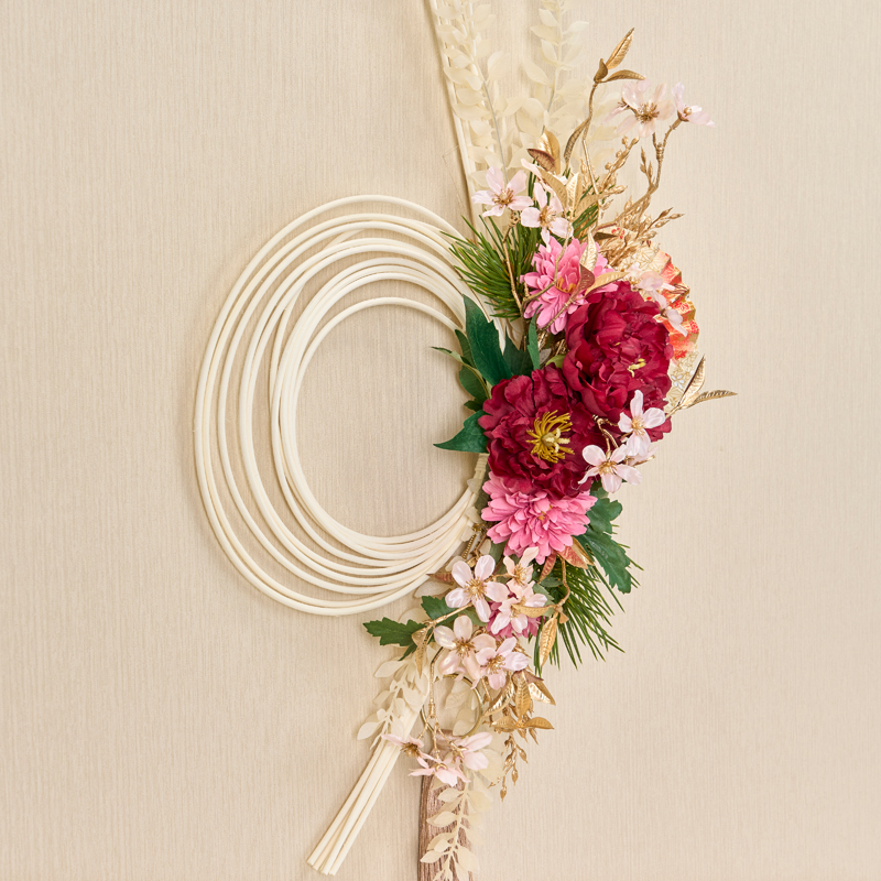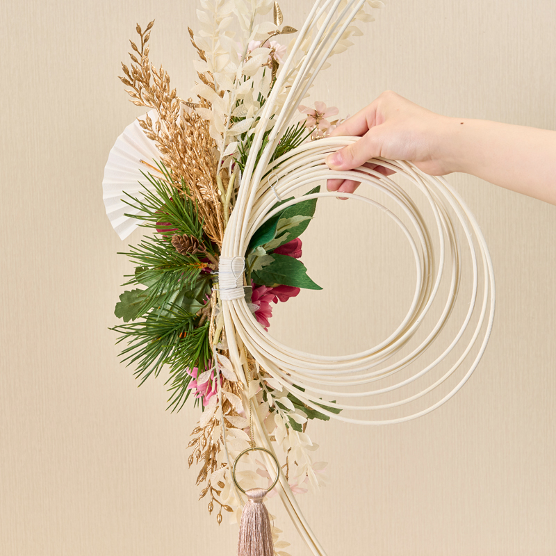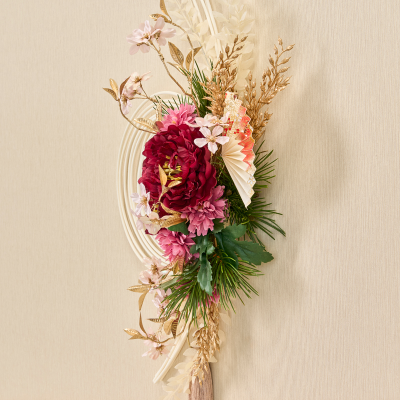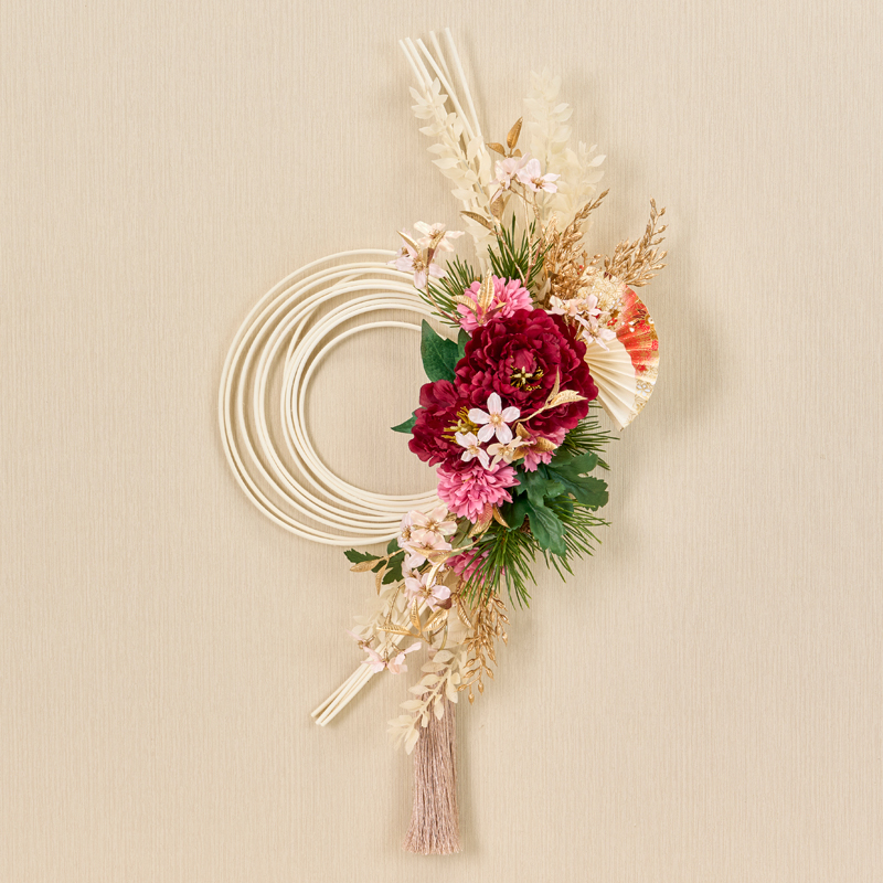 コメント | シックなピオニーに煌びやかな花材を合わせた大人っぽいしめ縄飾りです。 |