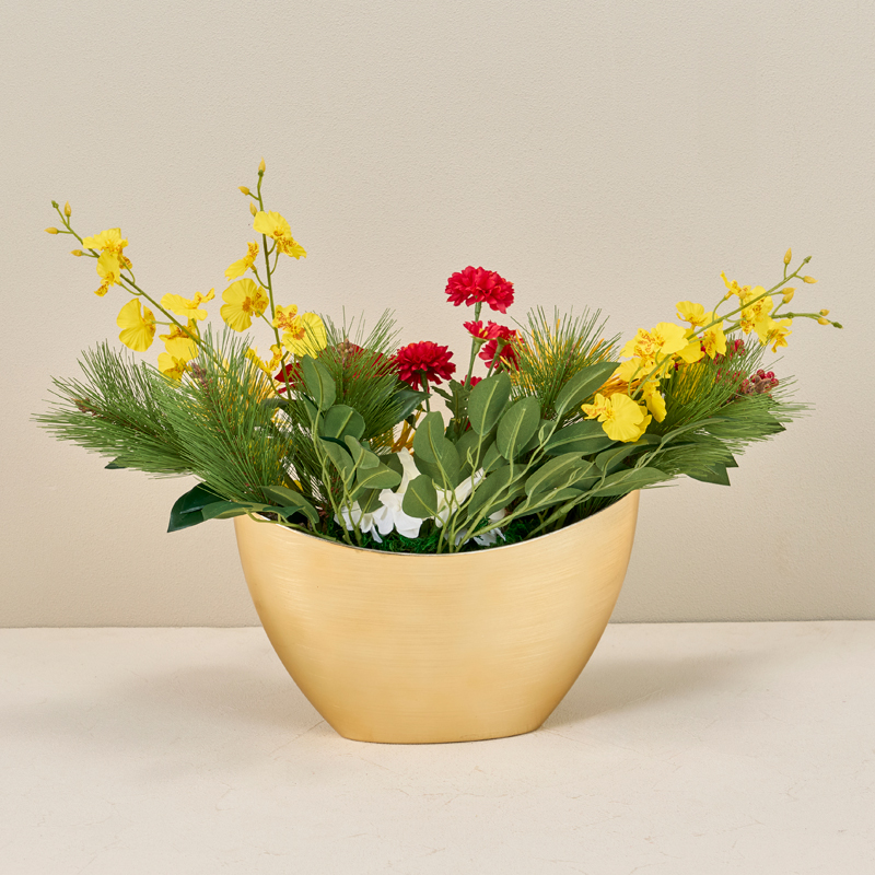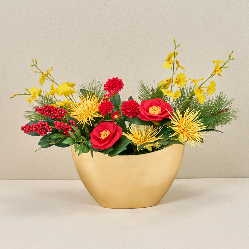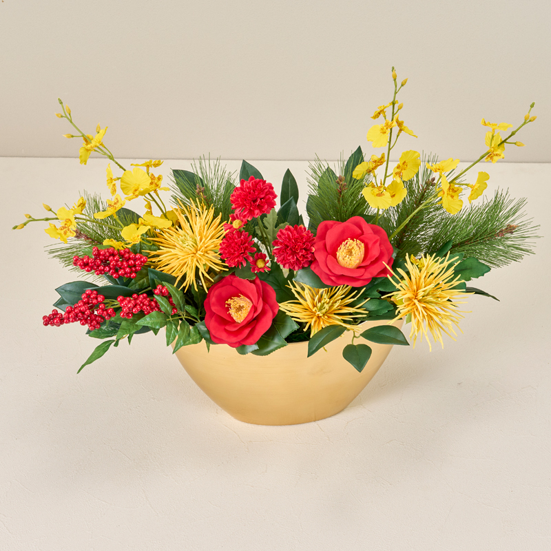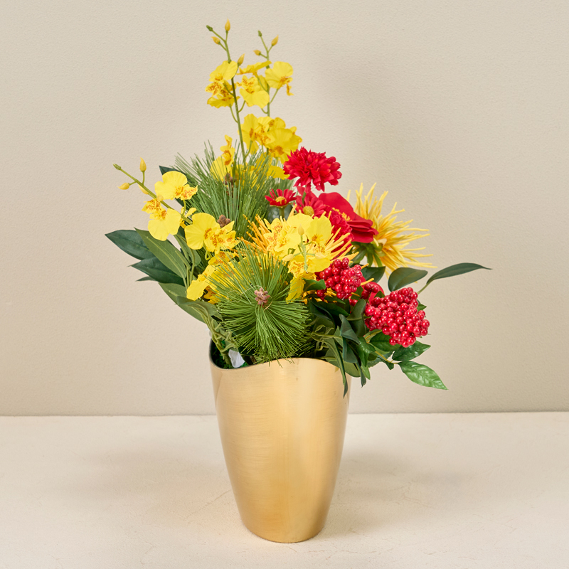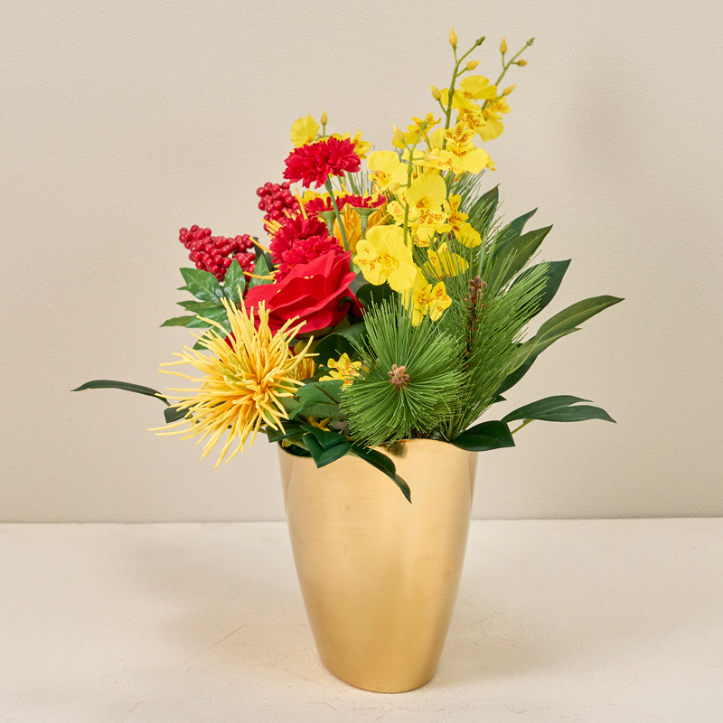 コメント | お正月カラーである黄色と赤の花材にゴールドベースを合わせたおめでたいアレンジメントです。 |