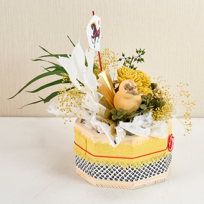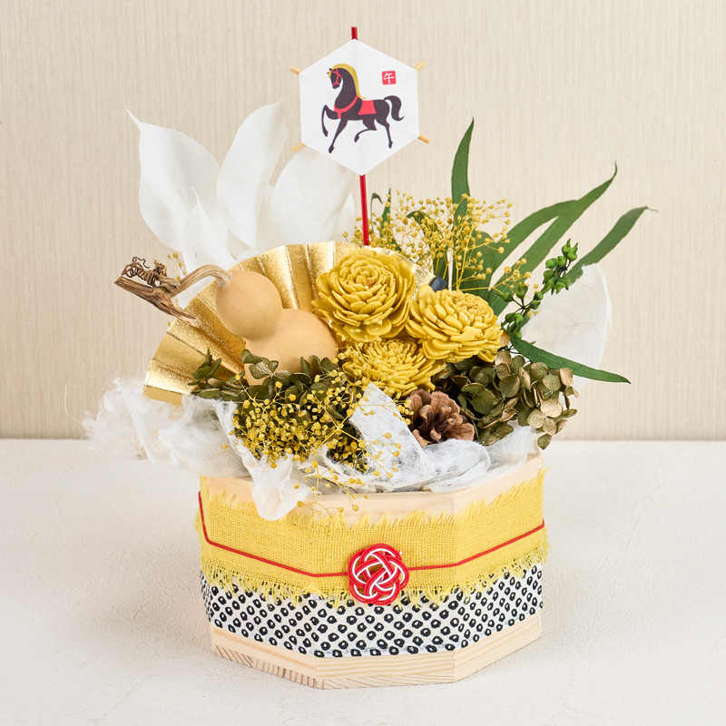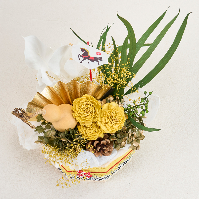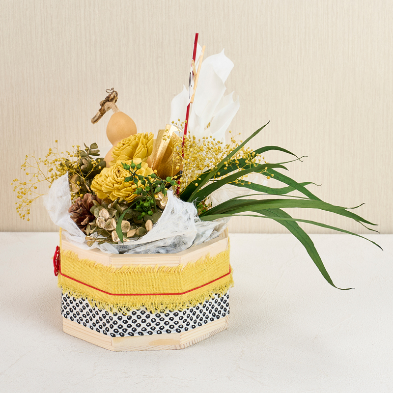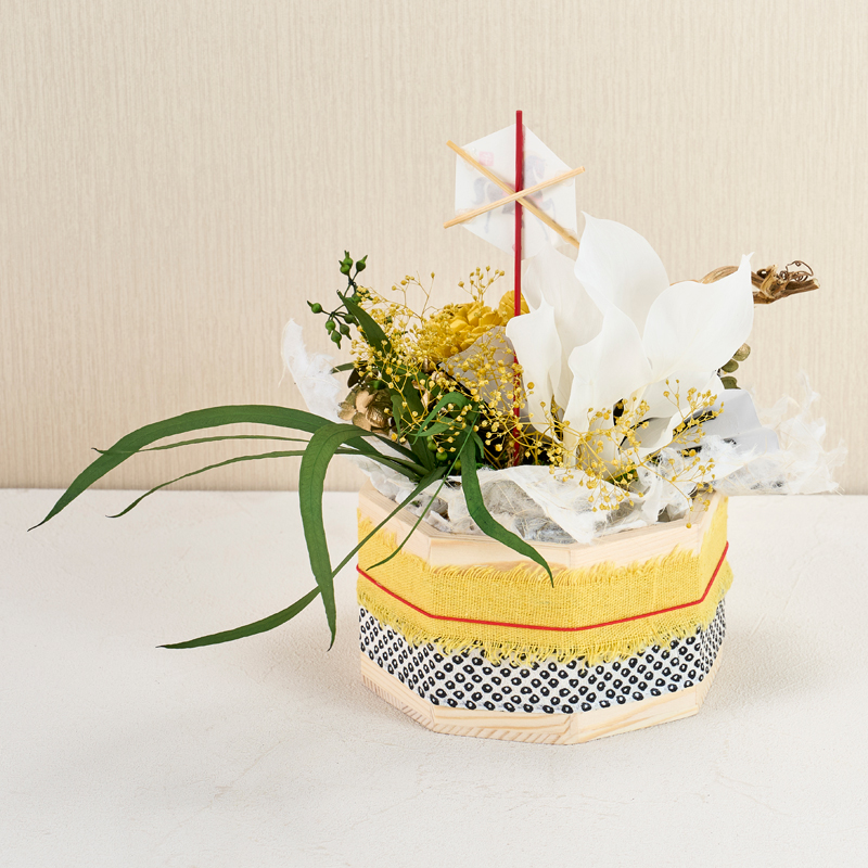 コメント | ベースにフォームをセットし、花材を挿しています。ベースのリボンは、ボンドで留めています。落水紙は手でちぎって雰囲気を出しています。 |