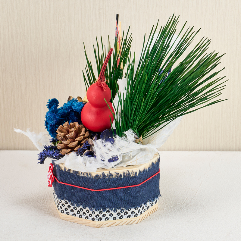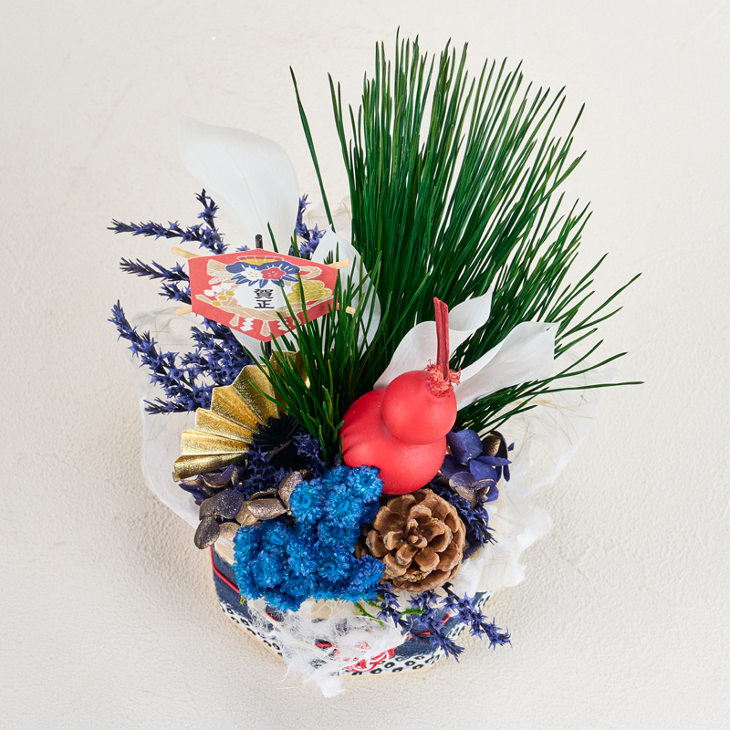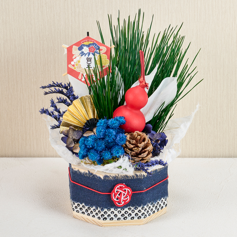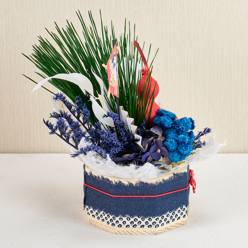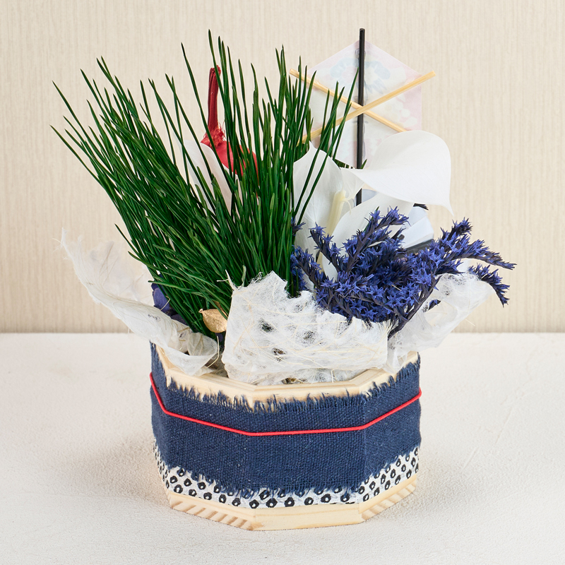 コメント | ベースにフォームをセットし、花材を挿しています。ベースのリボンは、ボンドで留めています。落水紙は手でちぎって雰囲気を出しています。 |
