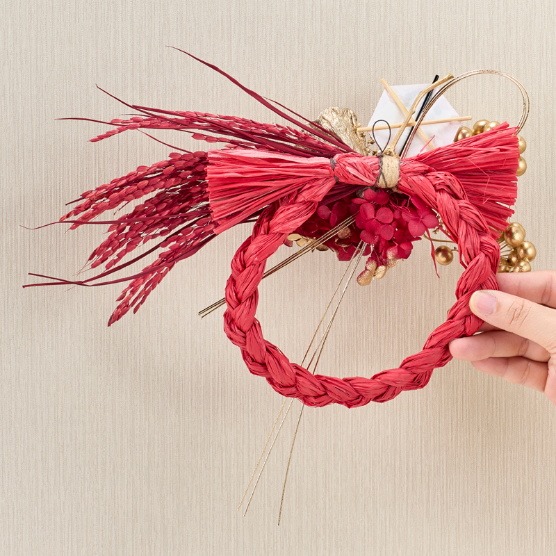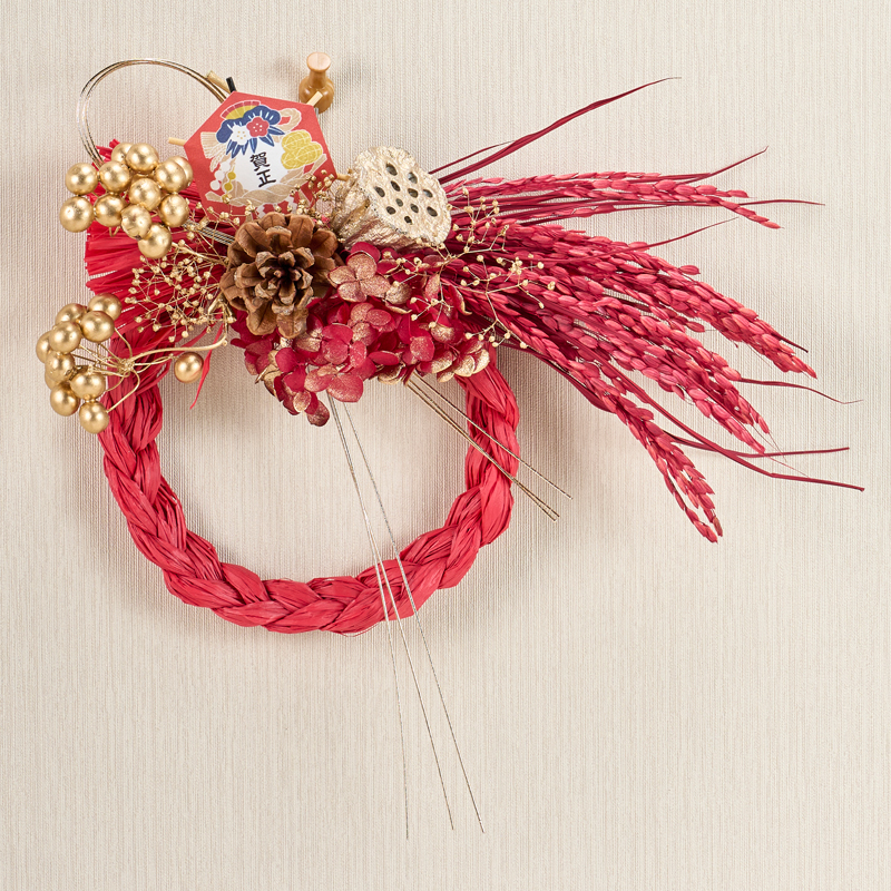 コメント | カラーラフィアを三つ編みし、ベースの形に整えてワイヤーでねじり留めています。花材の接着にはグルーとボンドを使用しました。ベースから手づくりできるレッスンとしておすすめです。 |