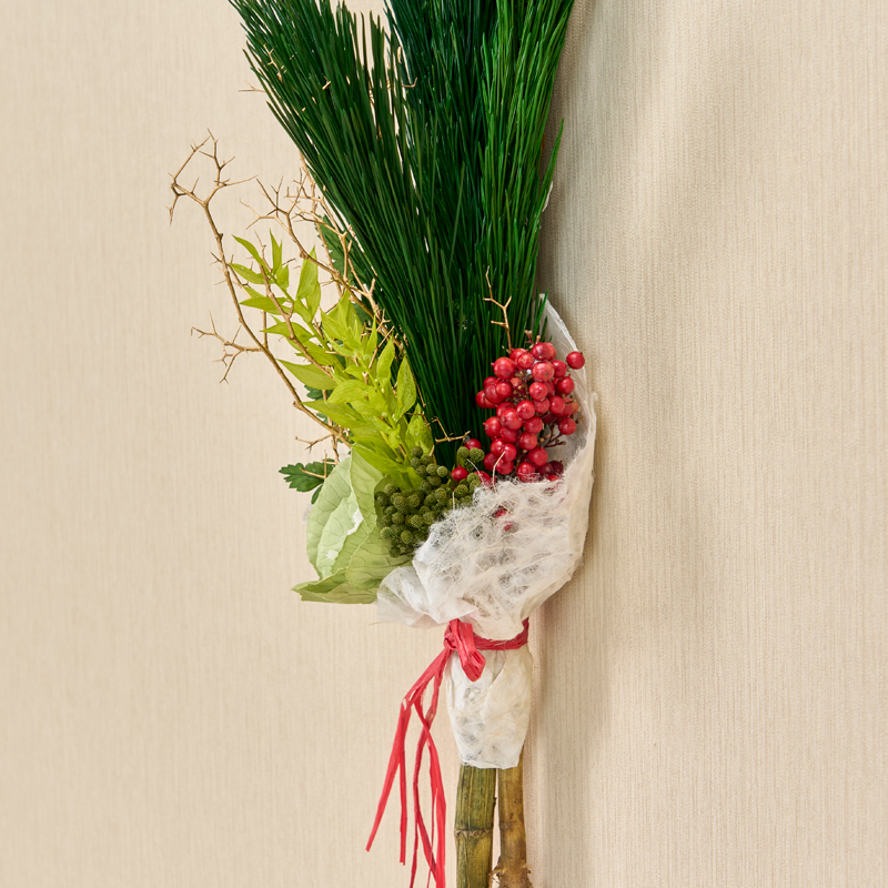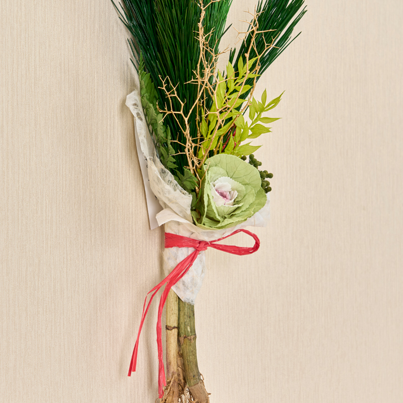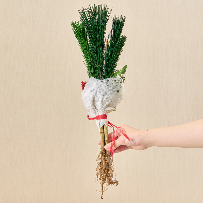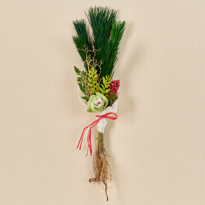 コメント | ひまわりの根っこと小枝松を組み合わせて根引き松のお飾りに見立てています。 |