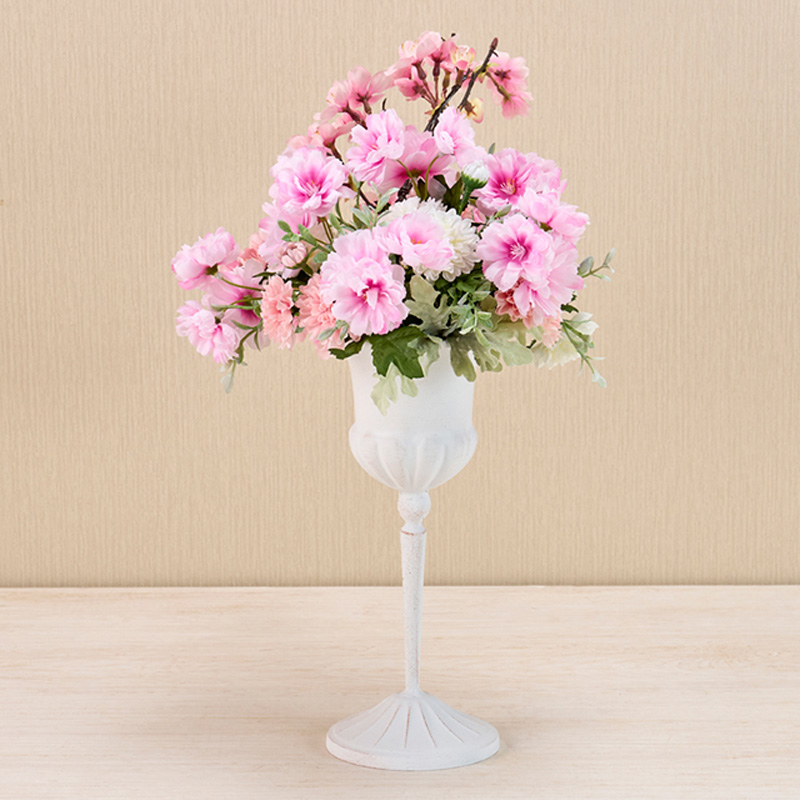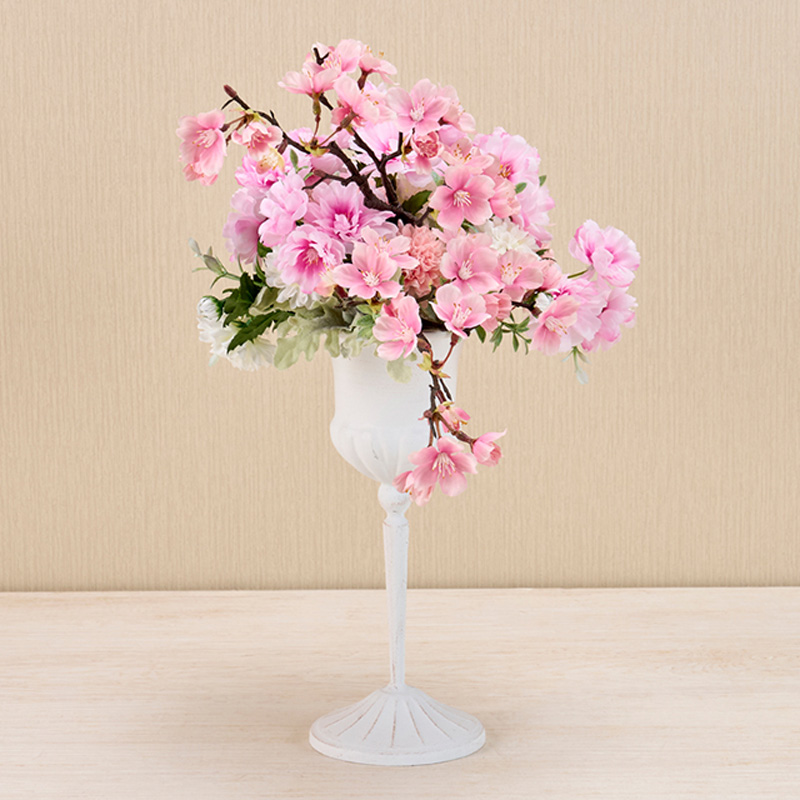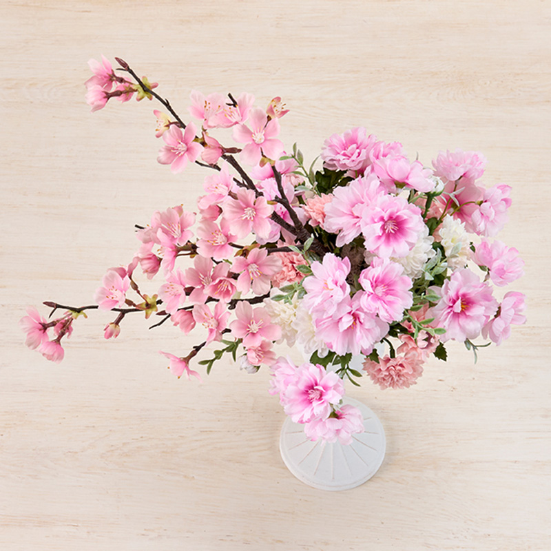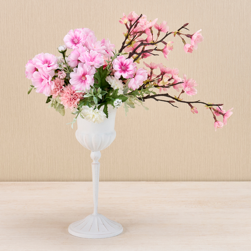 | コメント | ベースにフォームをセットし花材を挿しています。フォームが見える部分にボンドを付けてモスを敷いています。八重桜はふんわりと山桜は枝ぶりを生かして挿しています。 |