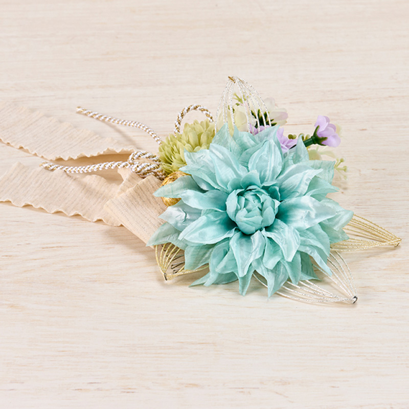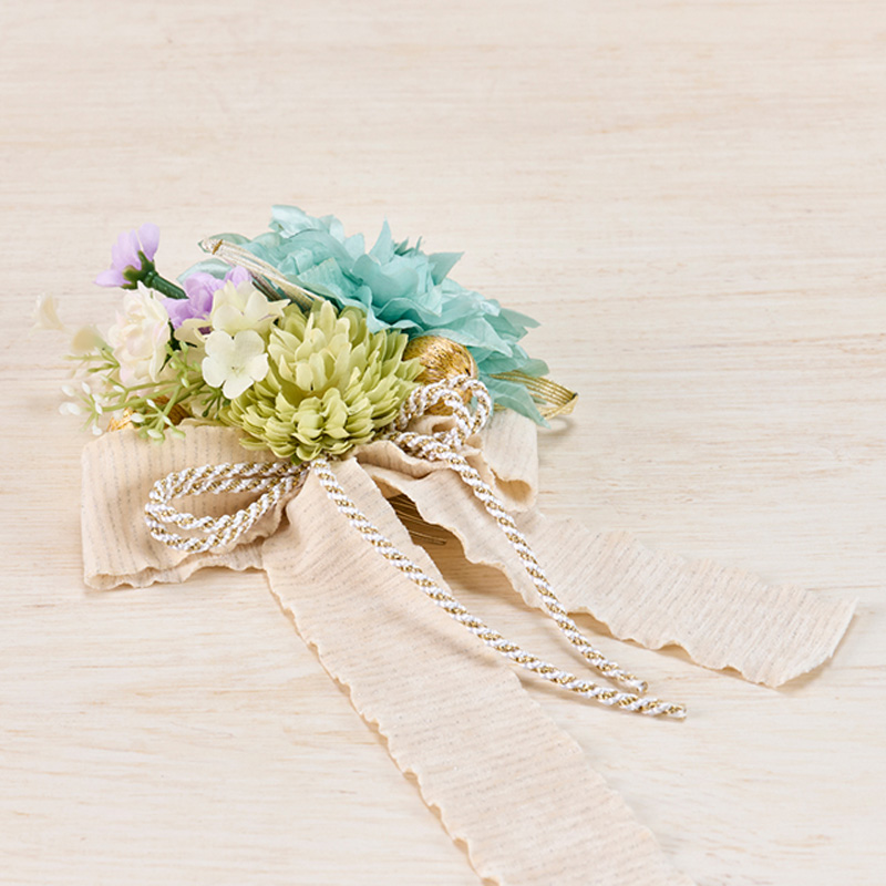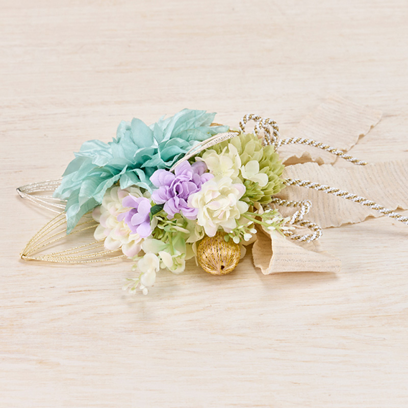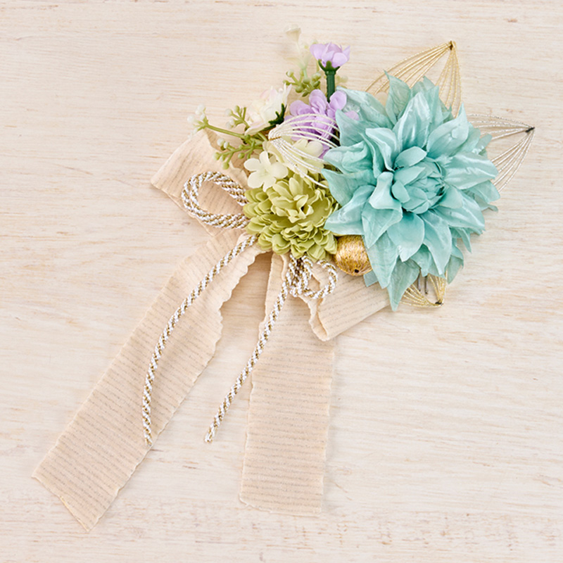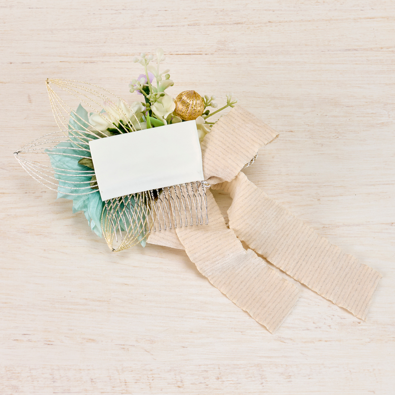 | コメント | コームに両面テープでリボンを貼り付け、そこにグルーガンで花材を接着しています。 |