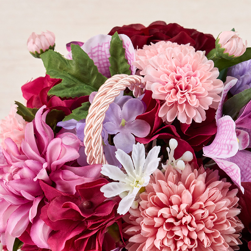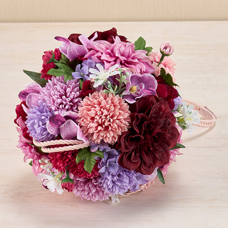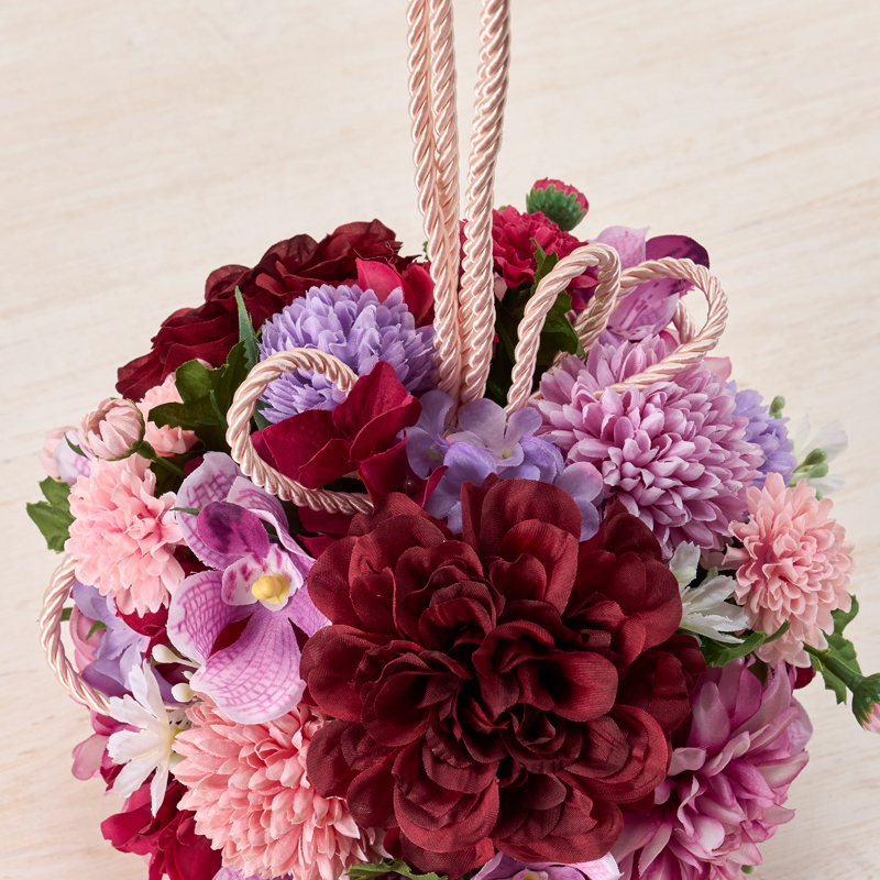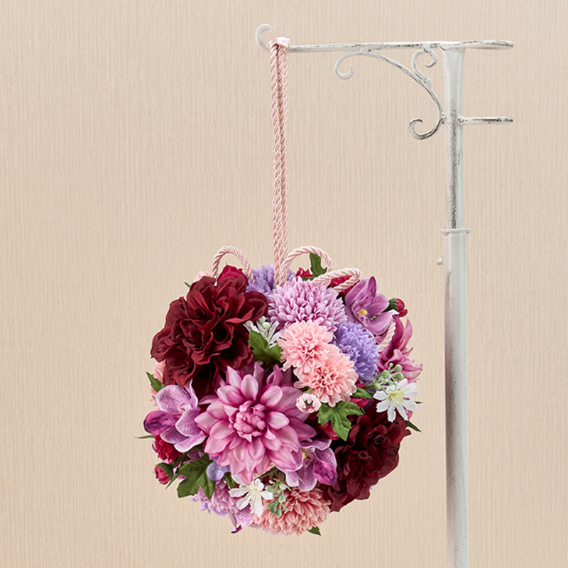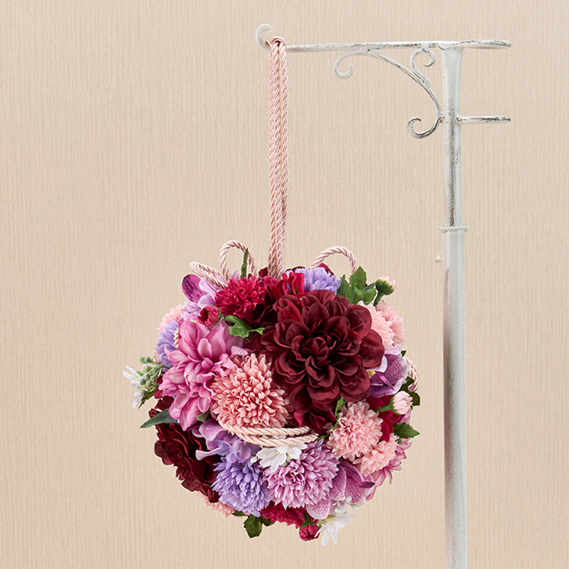 | コメント | 赤・紫系の色でまとめた和装用のボールブーケです。紐を固定した素ボールを土台にして花を挿しています。 |