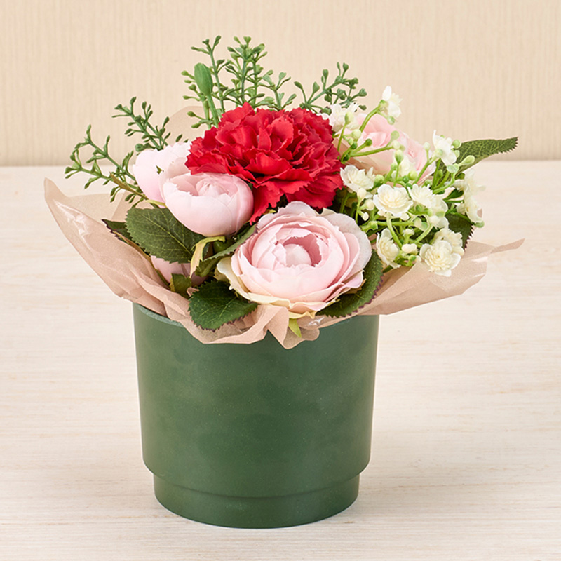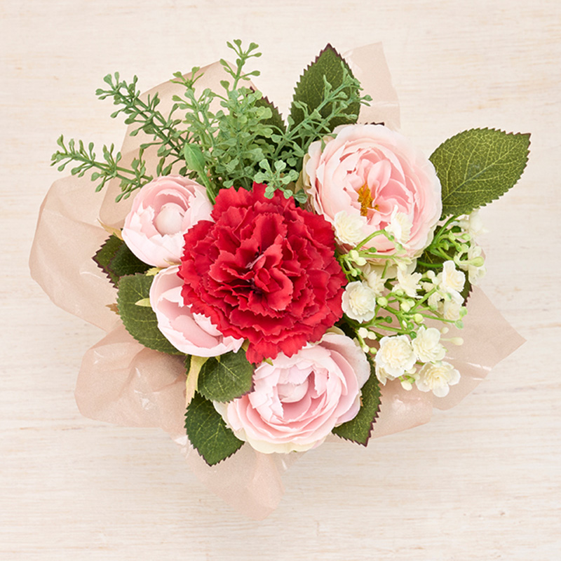 | コメント | 生花風にアレンジしました。ペーパーを2枚重ねてサハラスリーを包みベースにセットしています。 |