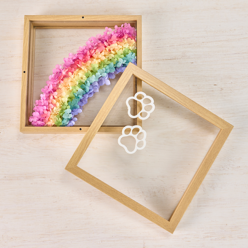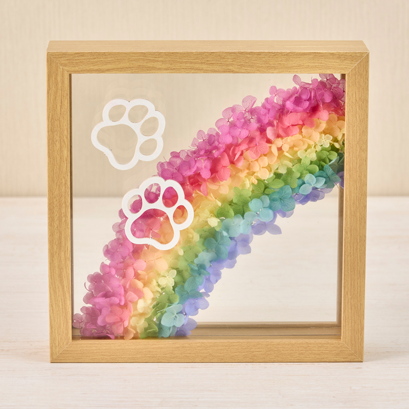 | コメント | 紙に下絵の虹を書きその上にエルビエの中間層シートを置いて、絵に沿って虹になるように各色のアジサイをアドヒーシブで貼っていきます。裏面も同じように貼ります。上層ガラスにステムをカットした肉球を貼ります。 |