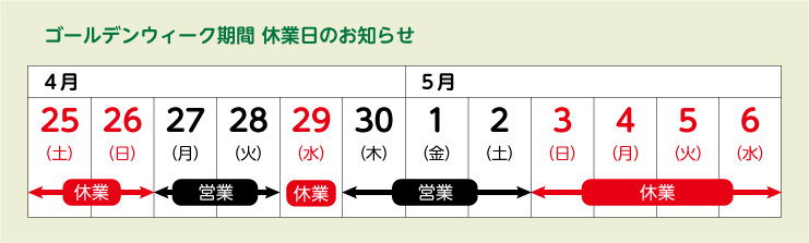 4月25日(土)・4月26日(日)・4月29日(水) 休業日