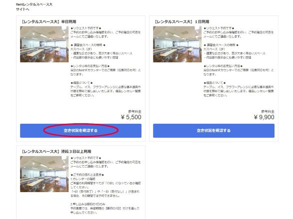 「【レンタルスペース大】連続3日以上利用」枠の最下段、「空き状況を確認する」青ボタンをクリックします。