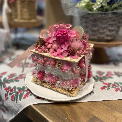 | レインボーフォームを挟んでクリームや小花でデコレーションしたケーキ風アレンジ。レッスンにおすすめです。 | 持ち手にワイヤーが入ったバスケットにアレンジ。取っ手部分を広げて、壁掛けにもできる2wayアレンジです。 |