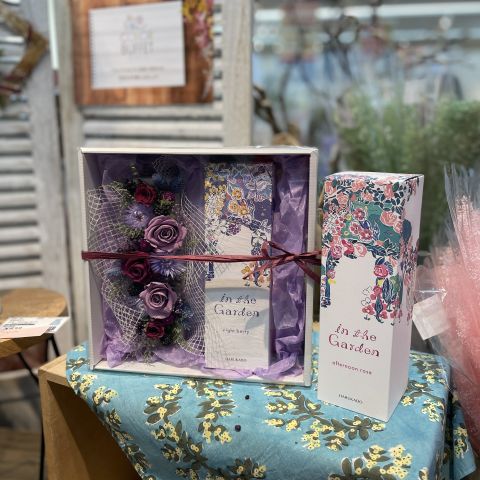 | ギフトといえばBOXアレンジ。花顔が大きなガーベラやコスモスで埋めればコストダウンに。 | ディフューザーのパッケージを活かしたギフトセットアレンジ。店頭でも目を引きます。 |