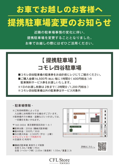 近隣の駐車場事情の変化に伴い、提携駐車場を変更することとなりました。