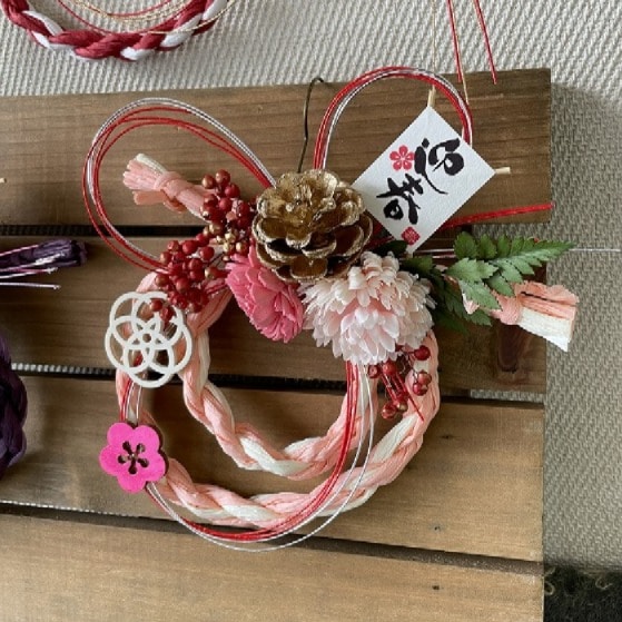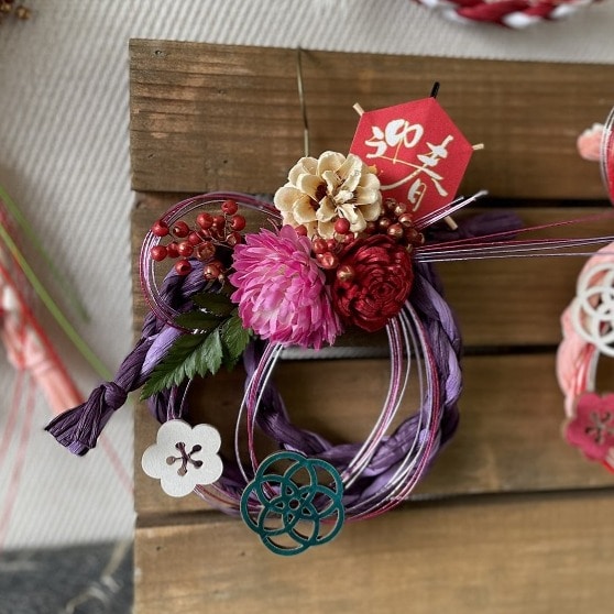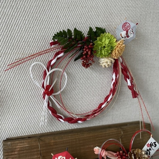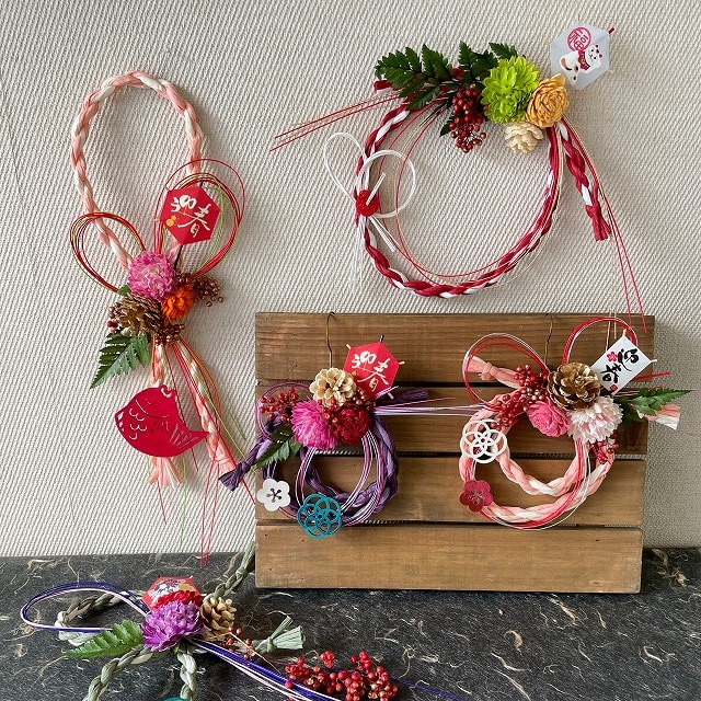 ベースができあがったら、お正月小物や花材を選び、お好みのデザインに仕上げます。